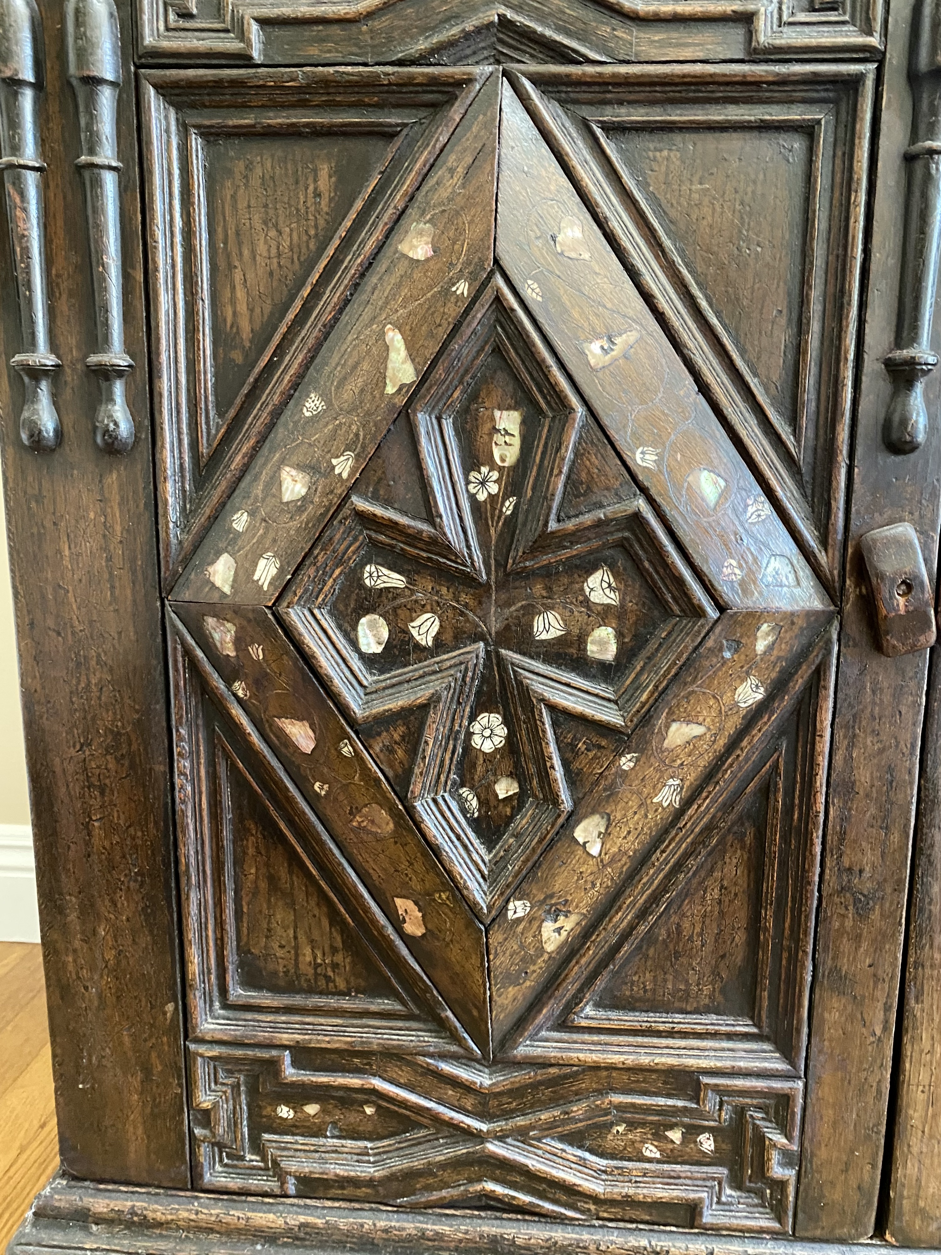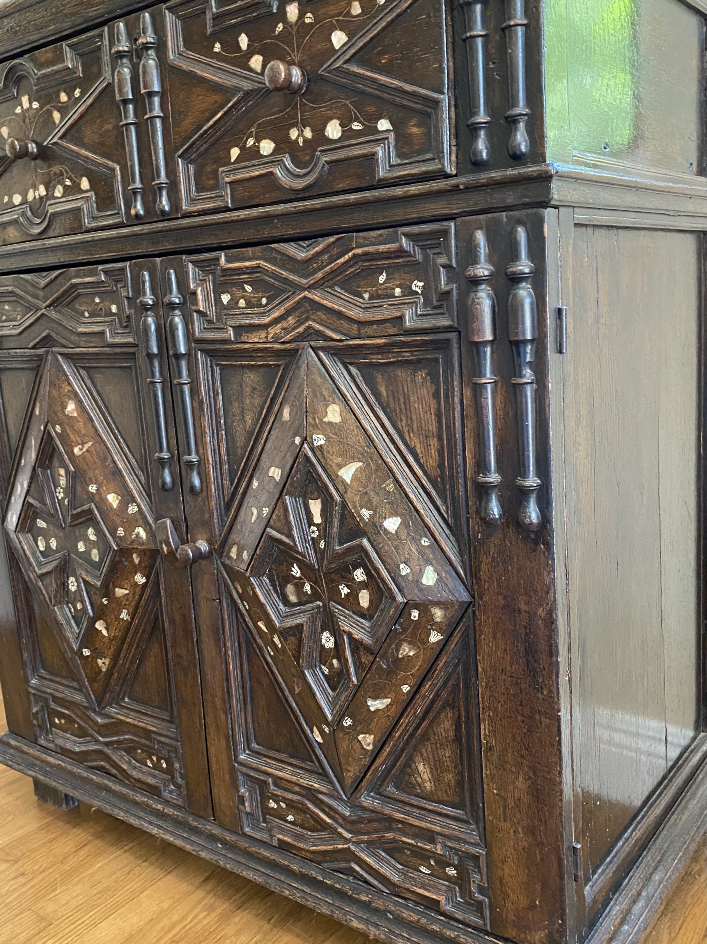 A Good 17th century Flemish mother of pearl inlaid oak cabinet with a pair of doors surmounted by a single deep drawer. Circa 1680
