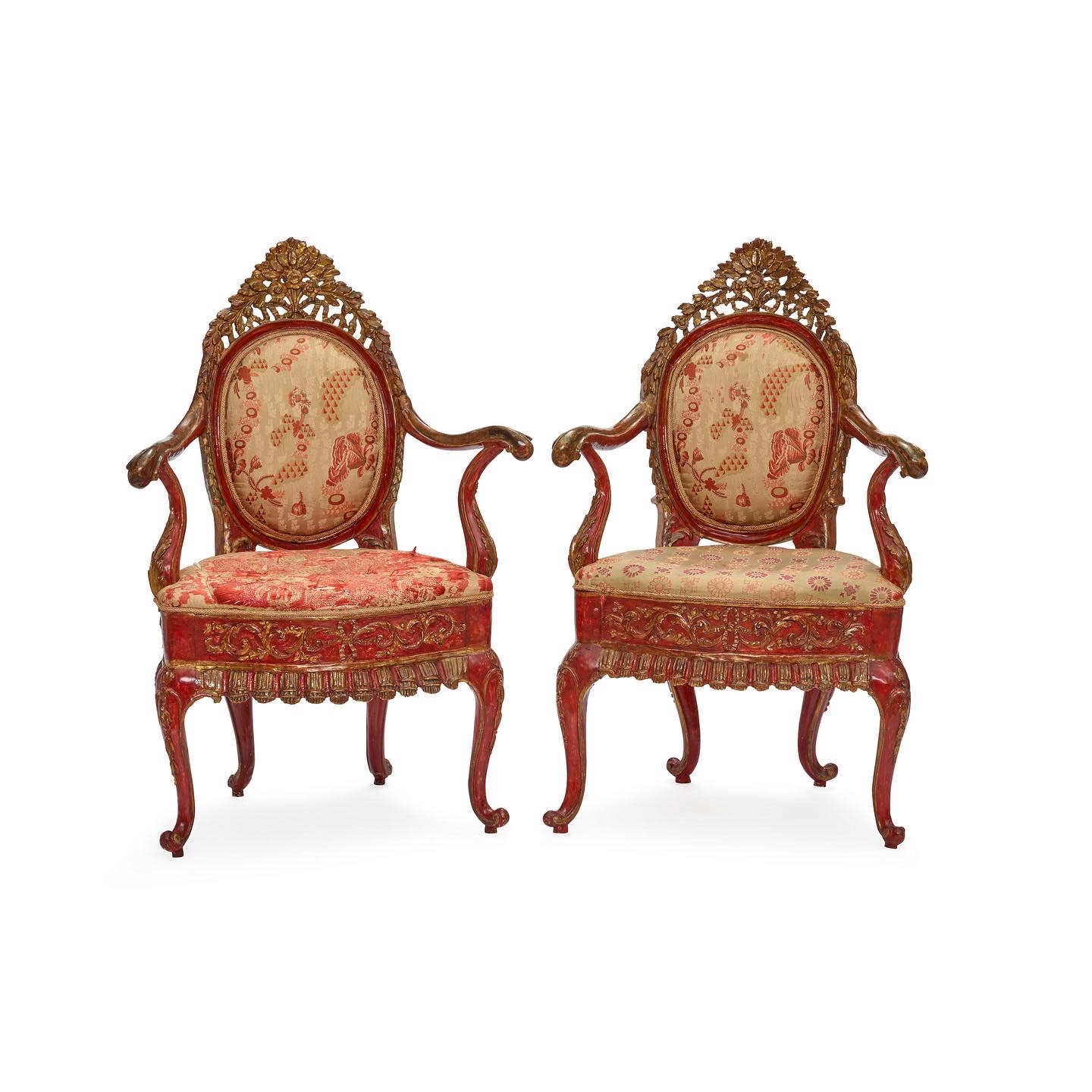 An Unusual Pair of Red Painted 18th Century Armchairs Most