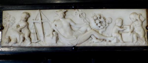 A fine Italian 18th century carved Carrara marble panel depicting putti surrounded by various allegorical objects and gifts signifying abundance. In period ebonized frame. Circa 1740.